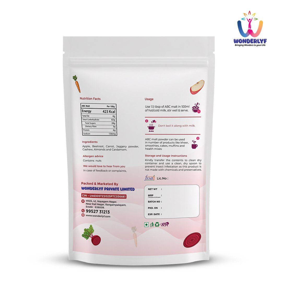 Elevate your daily routine with our ABC Malt, a wholesome blend of apples, beetroots, and carrots. This carefully prepared mix retains the natural goodness of its ingredients, offering a delicious and convenient way to enjoy nutrient-rich nourishment as part of a balanced diet.