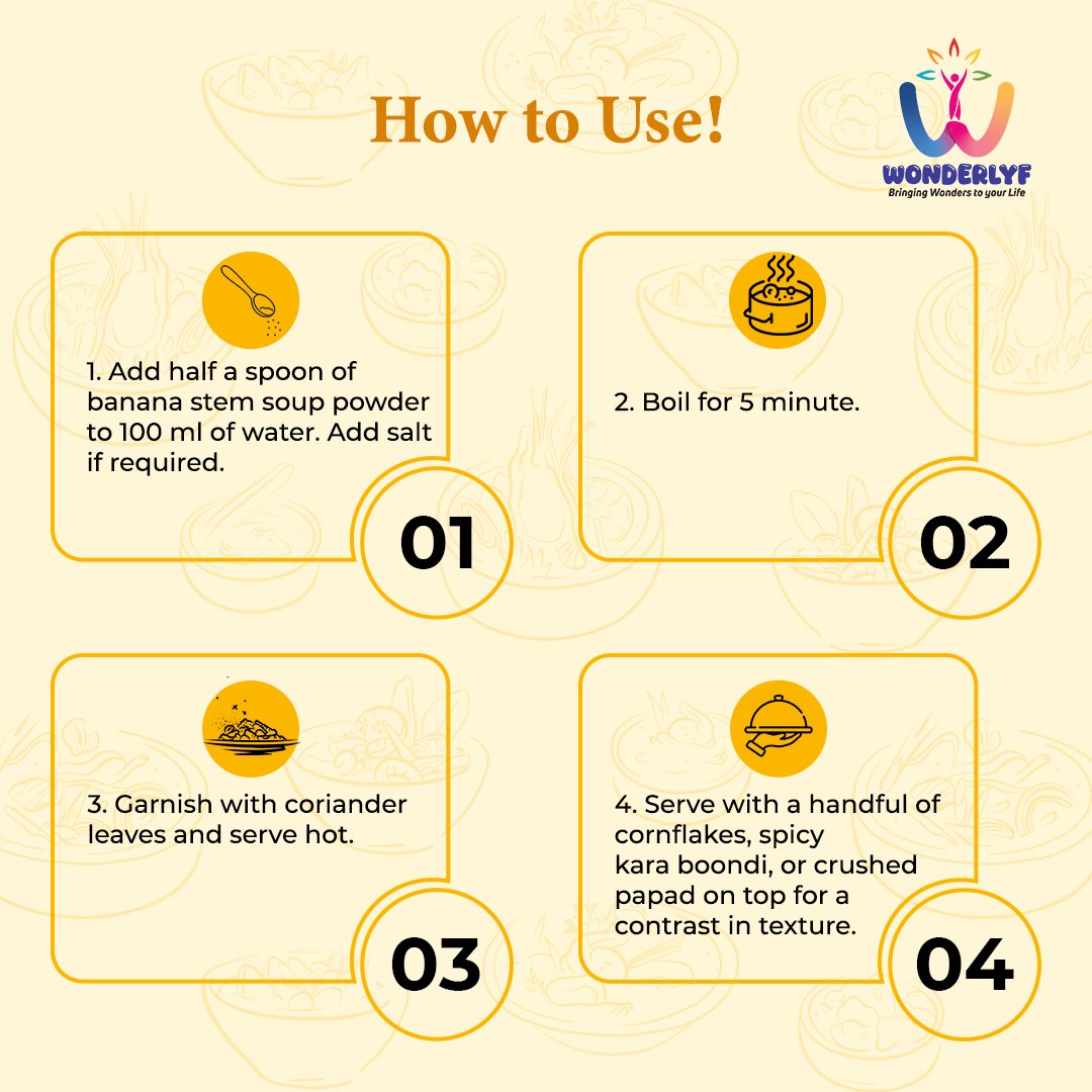 Add half a spoon of banana stem soup powder to 100 ml of water. Add salt if required. Boil for 5 minutes. Garnish with coriander leaves and serve hot. Serve with a handful of cornflakes, spicy kara boondi, or crushed papad on top for a contrast in texture.