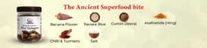 Experience the wholesome crunch of our Banana Flower Vadagam. Made with banana blossom and Navara rice, a traditional variety valued in Ayurveda, these sun-dried crisps offer a unique way to enjoy time-honoured ingredients in every bite. Carefully prepared using traditional methods, they bring authentic flavour and nourishment to your meals.