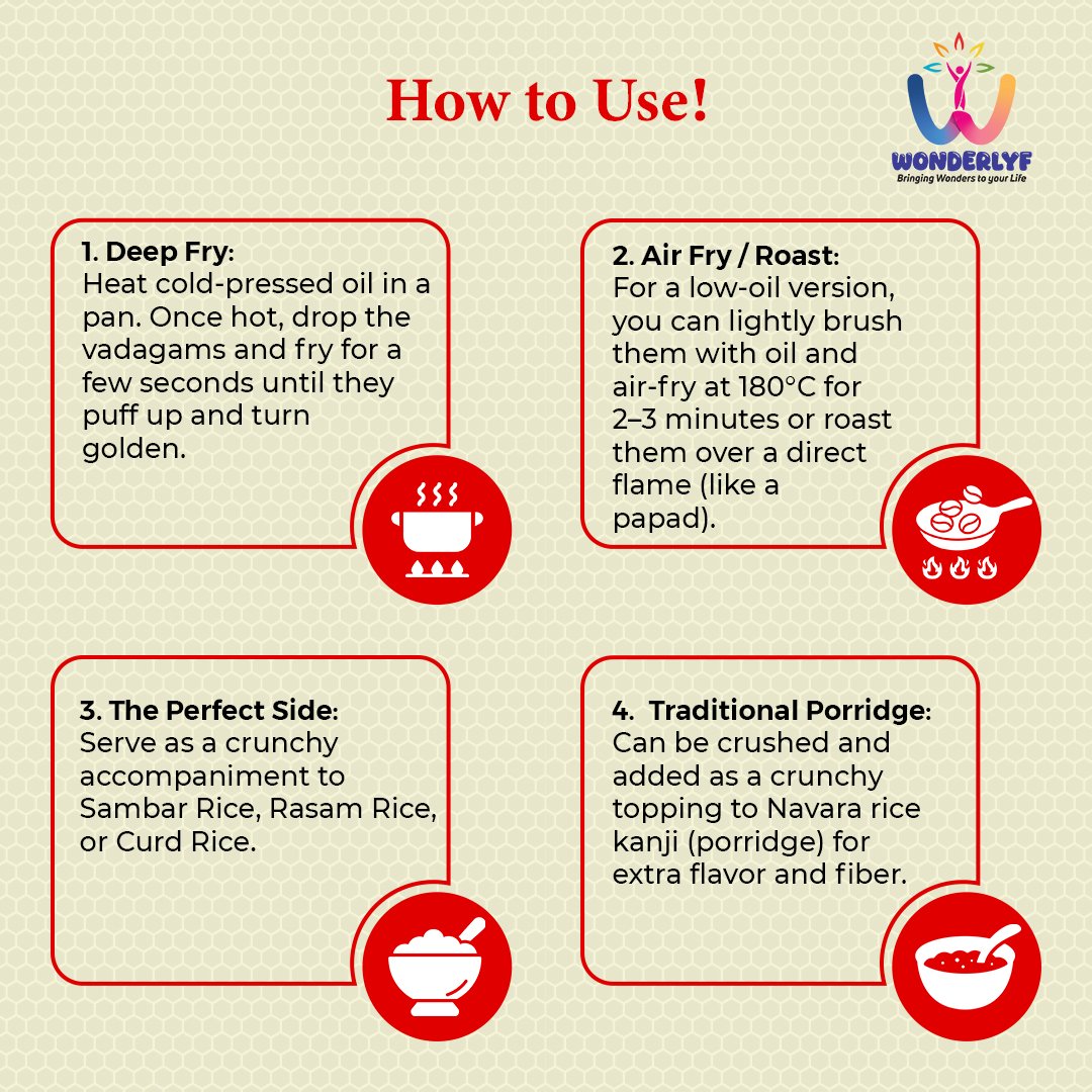 - Deep Fry: Heat cold-pressed oil in a pan. Once hot, drop the vadagams and fry for a few seconds until they puff up and turn golden.