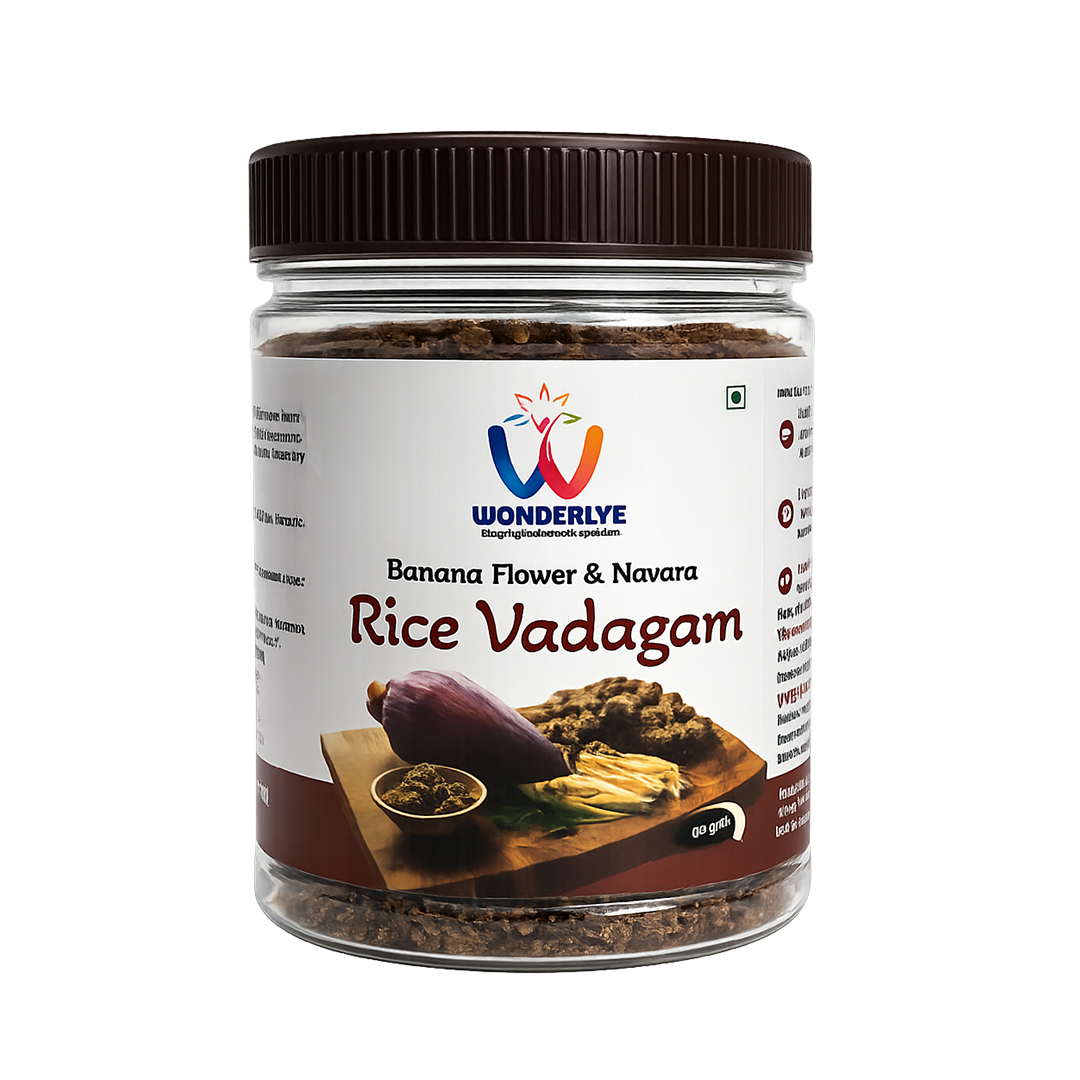Experience the wholesome crunch of our Banana Flower Vadagam. Made with banana blossom and Navara rice, a traditional variety valued in Ayurveda, these sun-dried crisps offer a unique way to enjoy time-honoured ingredients in every bite. Carefully prepared using traditional methods, they bring authentic flavour and nourishment to your meals.